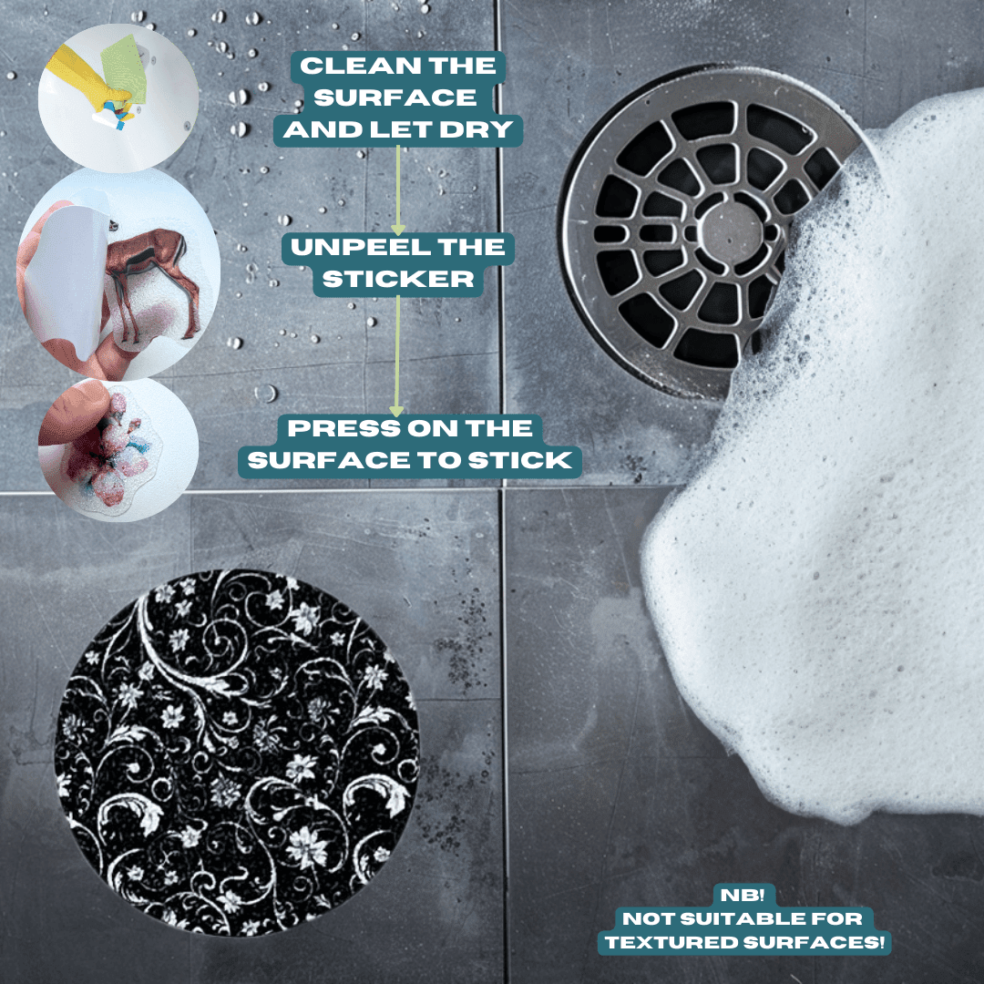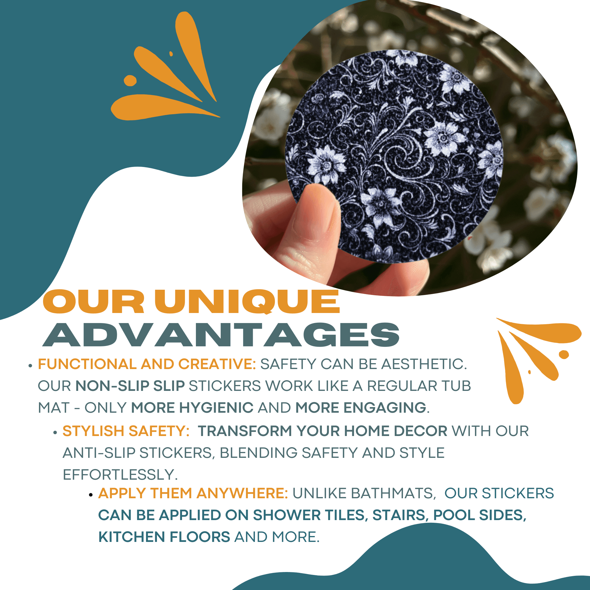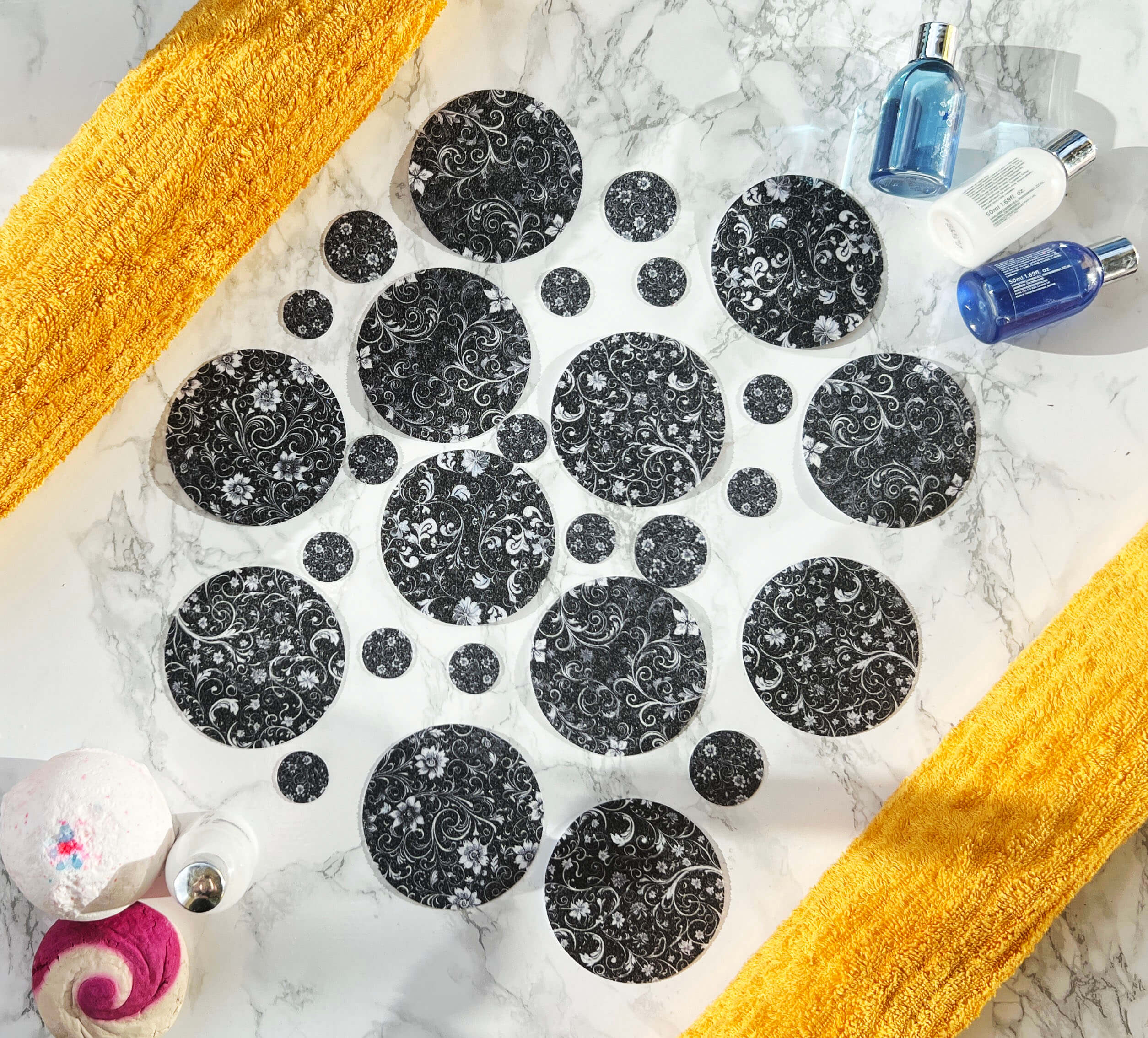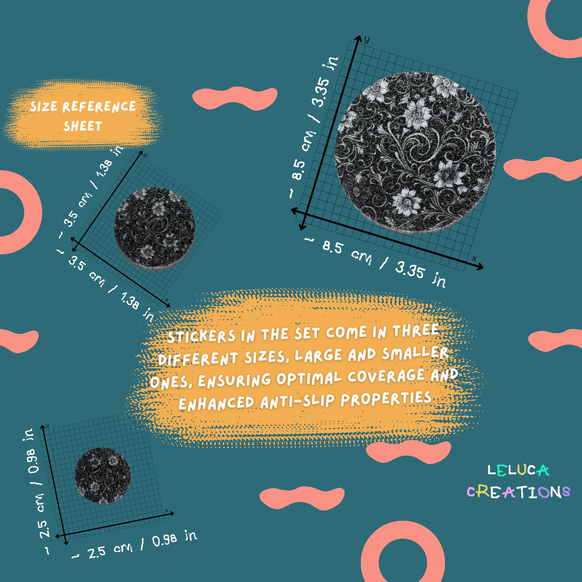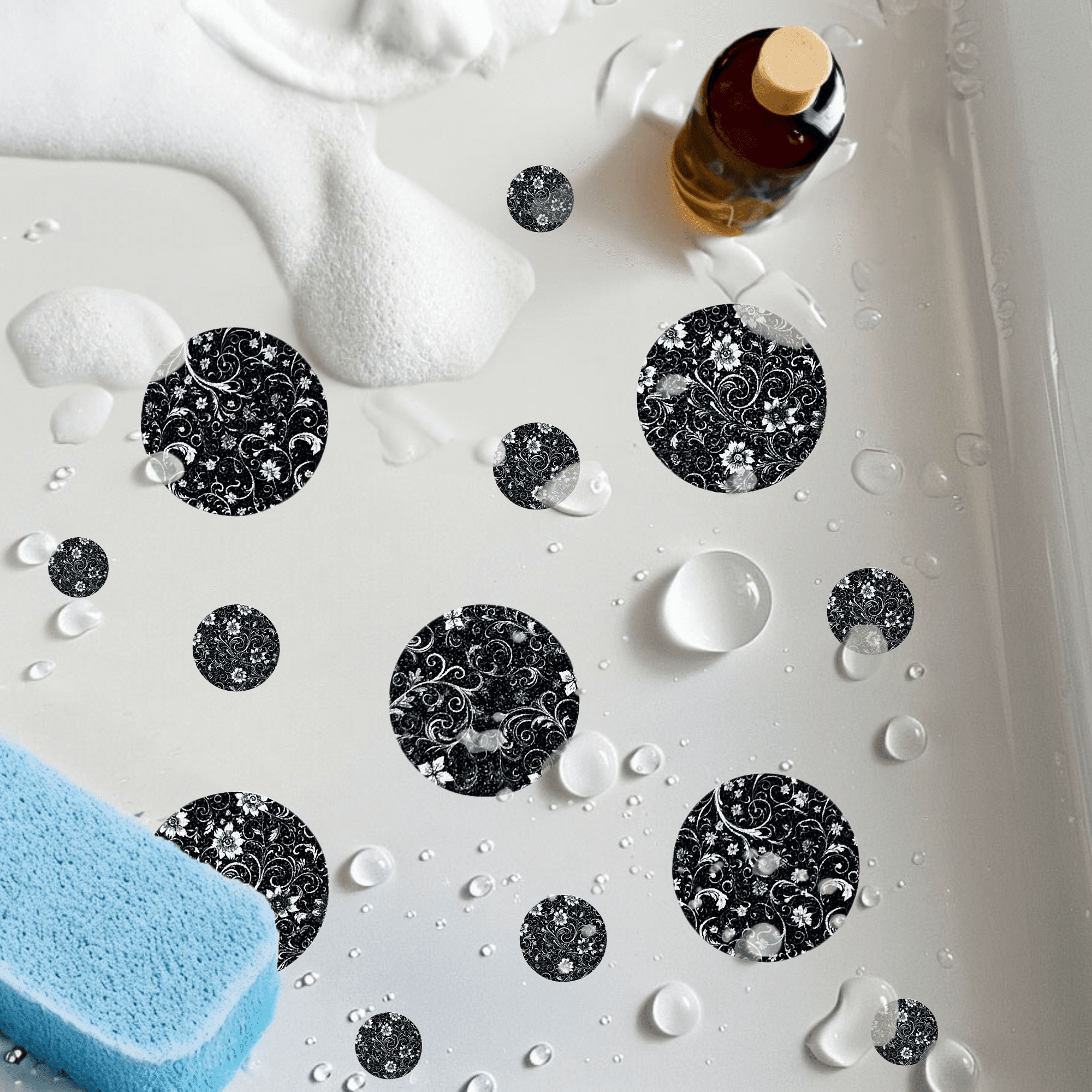 Approximately 80 percent of residential falls occur in the bathrooms, showers and stairs. To address this threat, we are dedicated to providing a simple and effective solution with our anti-slip stickers. These stickers not only increase safety by reducing the risk of slips and falls, but they also enhance the look of your bathroom with their stylish black and white flower sticker designs, serving both as a functional safety feature and an attractive design element. Our sets are designed so they would cover a substantial area of your tub or shower. 🛁