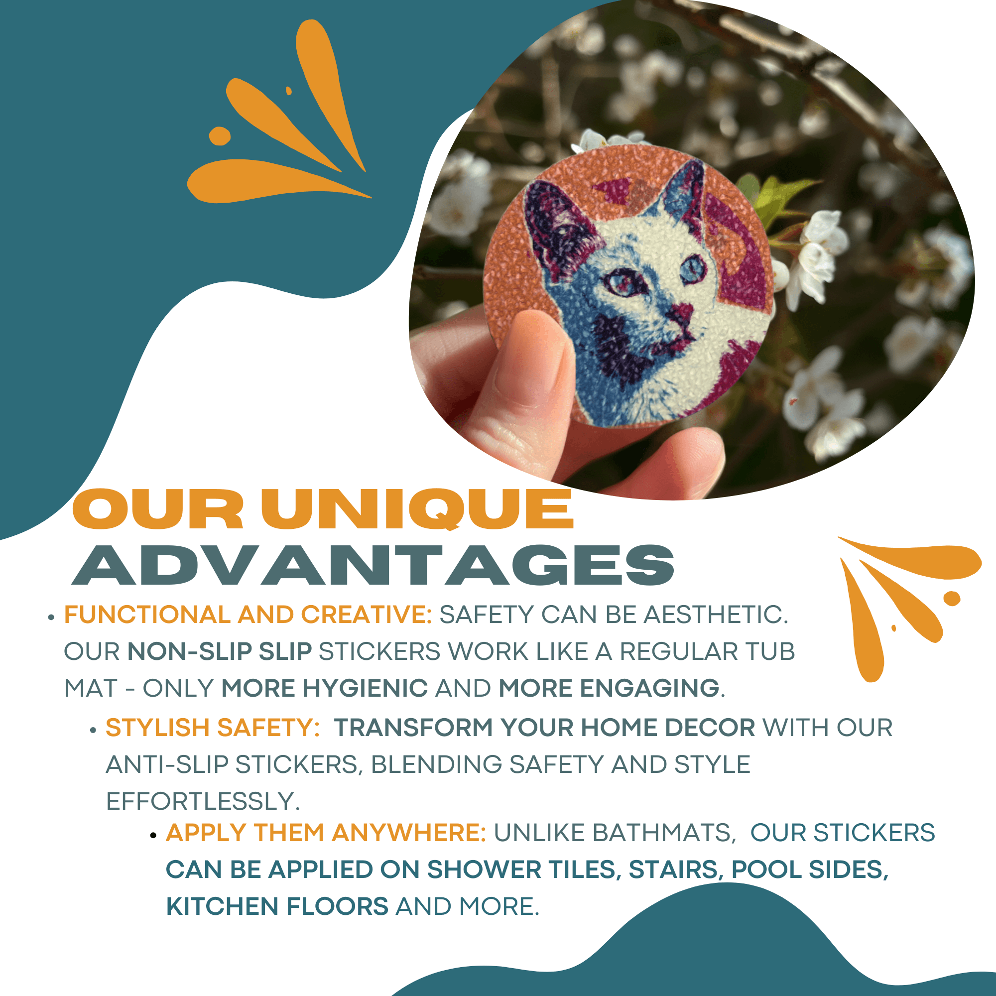 Approximately 80 percent of residential falls occur in the bathrooms, showers and stairs. To address this threat, we are dedicated to providing a simple and effective solution with our anti-slip stickers. These stickers not only increase safety by reducing the risk of slips and falls, but they also enhance the look of your bathroom with their stylish pop art cat design, serving both as a functional safety feature and an attractive design element. Our sets are designed so they would cover a substantial area of your tub or shower. 🛁