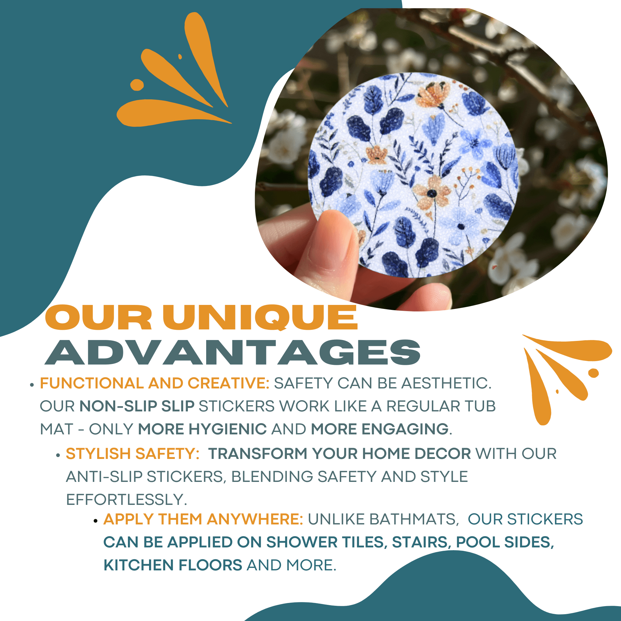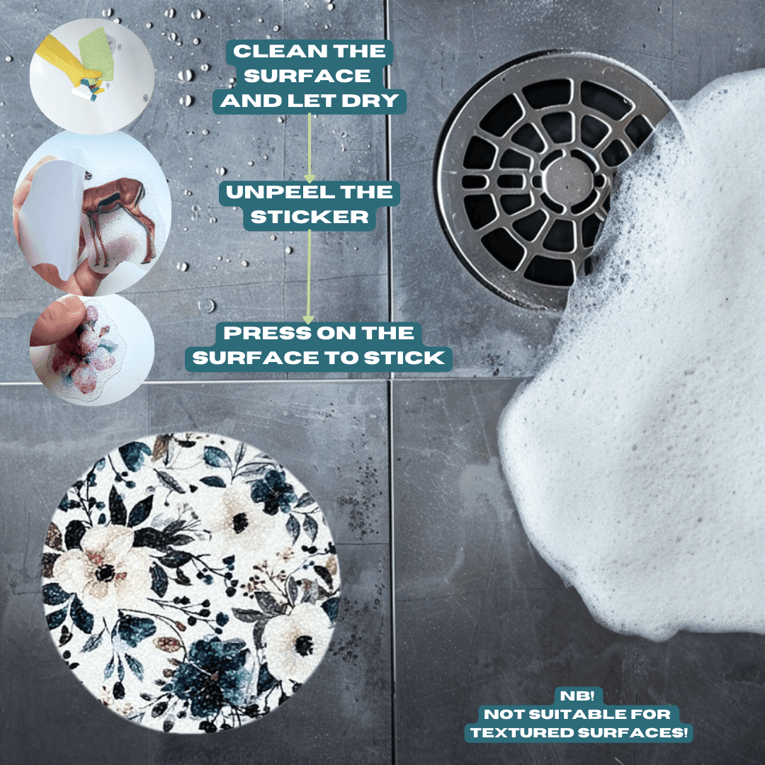 Approximately 80 percent of residential falls occur in the bathrooms, showers and stairs. To address this threat, we are dedicated to providing a simple and effective solution with our anti-slip stickers. These tub decals not only increase safety by reducing the risk of slips and falls, but they also enhance the look of your bathroom with their stylish design, serving both as a functional safety feature and an attractive design element. Our sets are designed so they would cover a substantial area of your tub or shower. 🛁