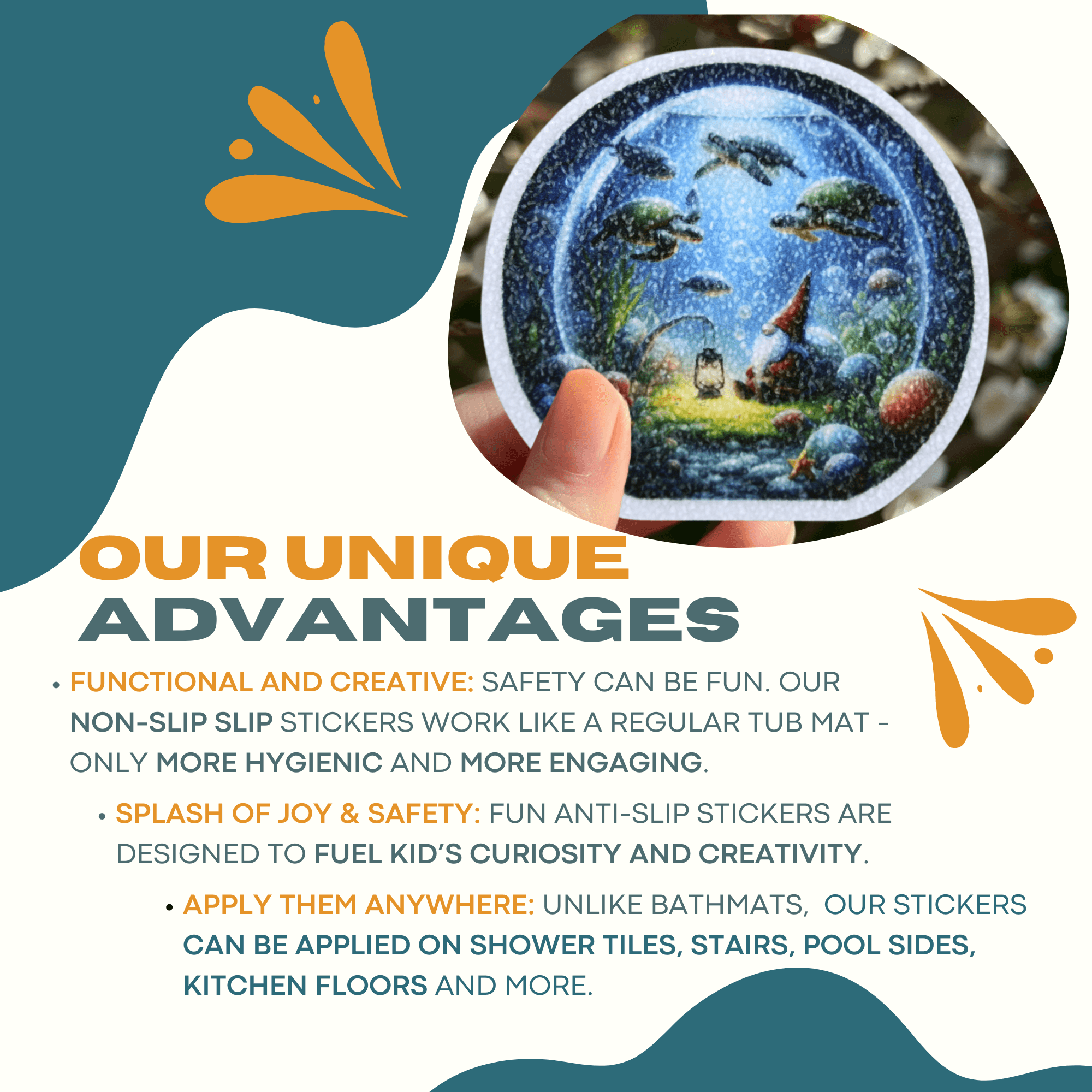 • Functionality Meets Creativity: Who said safety can’t be fun? These stickers work like a traditional tub mat—only way cuter and less bulky.
